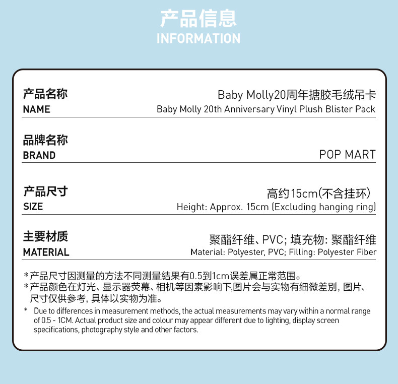 POP MART泡泡瑪特【BABY MOLLY】20周年紀念搪膠毛絨掛件